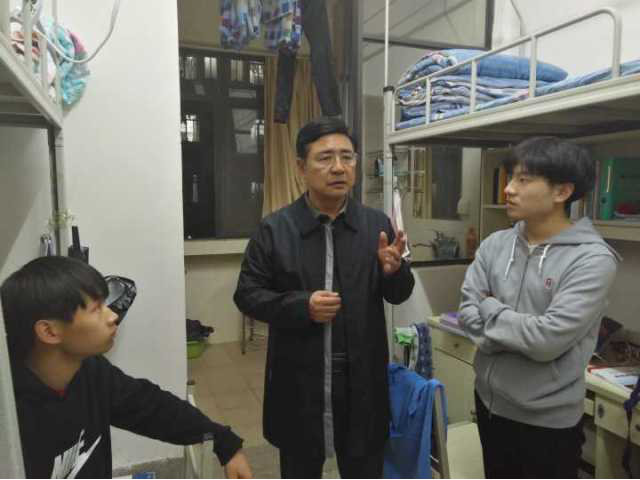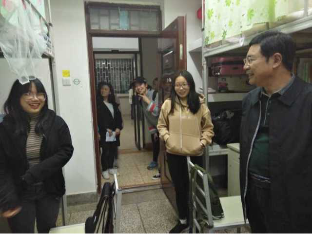副院长骆洪教授与辅导员徐天琴老师走访了2016级学生宿舍。骆老师非常关心同学们晚上自习的问题,耐心询问了同学们平时晚上去哪里学习,并告诉同学学校专门在晚上开放了所有教室,图书馆、自习室都是很好的学习场所,希望同学们不要浪费青春时光,抓住点滴时间学习。在男生宿舍,骆老师认真检查了同学们的宿舍安全问题,并告诉同学要勤通风、注意宿舍环境卫生。