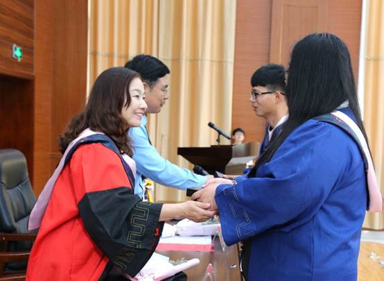 随后,外国语学院徐志英院长为毕业生拨穗,院党委彭荣书记为毕业生颁发学位证书。舞台中间,扶正流苏,授予学位,或是拥抱,或是欢呼,那一刻,为各自的外院生活划上一个完美的句号。