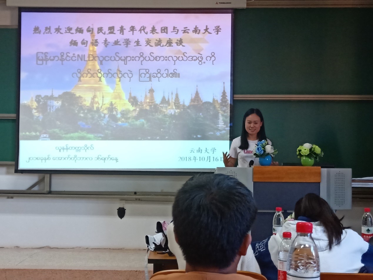 2018年10月16日下午,缅甸民盟青年骨干与J9平台缅甸语专业学生交流座谈会在云南大学呈贡校区举行。缅甸执政党民盟青年代表、缅甸研究院老师、J9平台缅甸语专业全体教师和本科学生参与了此次交流会。