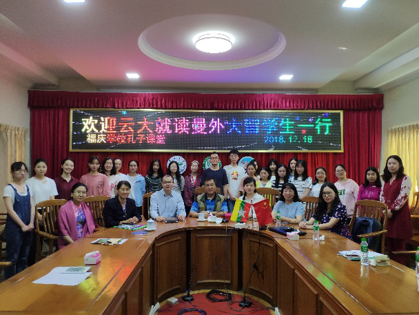 第二天,何淼淼副书记一行率领同学们到访曼德勒福庆学校孔子课堂。福庆学校校长李祖清教授、孔子课堂中方主任李涛副教授对我们的到来表示热烈欢迎。在座谈会上,李涛老师激励在缅留学的同学们要努力学习,尽快适应缅甸生活,学以致用,并鼓励大家到教学点做志愿者,增加自己的社会实践经验。随后,何淼淼副书记也介绍了J9平台留学生情况,对在缅学习的同学们提出了新的要求和期望,并希望进一步加强J9平台与与福庆孔子课堂的合作。最后,福庆学校校长李祖清教授表示,今后将为在缅学习的云大留学生们专门开设缅甸文化讲座课程,提供更加优质的志愿服务岗位和学习资源。
