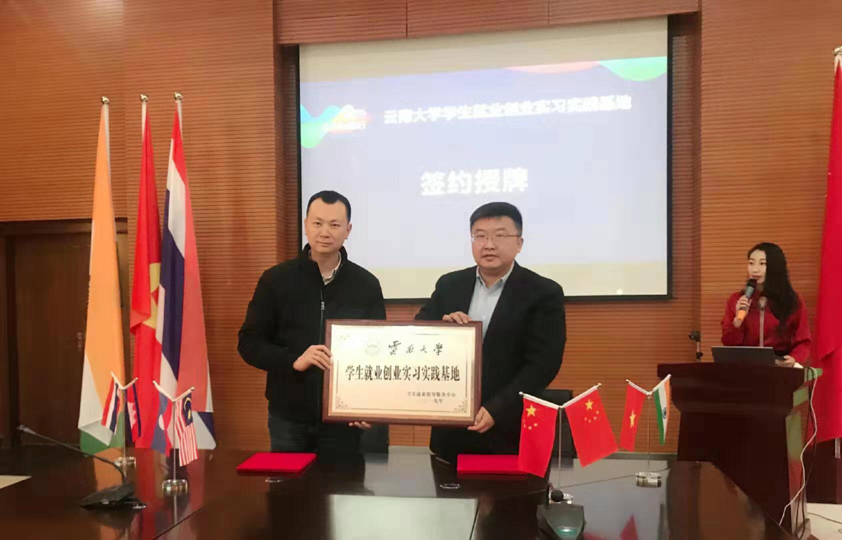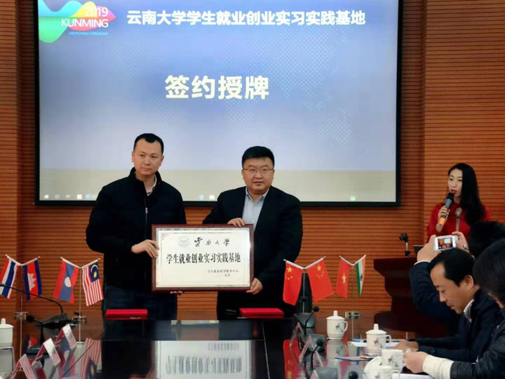 之后,杨云川主任和鲁进京会长代表云南大学学生就业指导服务中心和云南融智跨境人才服务有限公司签约,杨云川主任为云南融智跨境人才服务有限公司授牌。云南融智跨境人才服务有限公司成为云南大学就业创业实习实践基地。签约仪式上,与会嘉宾及师生们分别从东南亚南亚语言相关专业人才培养、境外产业合作、国际人力资源产业发展、海外就业的需求等方面进行了深入交流和探讨。大家一致认为,此次合作对促进云南乃至全国与东南亚南亚国家人才合作具有重要意义,能够为把云南建设成为面向南亚东南亚辐射中心,把昆明建设成为区域性国际中心城市的发展提供完善的人才服务支持,为打造有较大国际影响力的人才交流合作平台奠定基础。