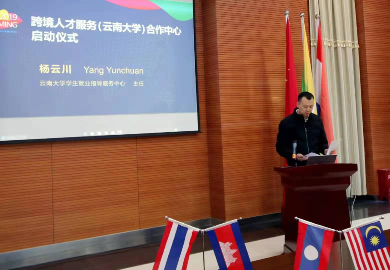 仪式一开始,云南大学学生就业指导服务中心杨云川主任致辞。杨主任回顾了云南大学近百年来的发展状况,并指出合作中心成立后,学校将以外国语学院为龙头单位,实现就业“学生参与、学校参与、社会参与”。