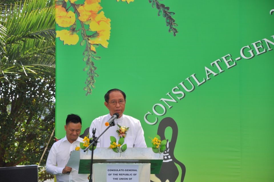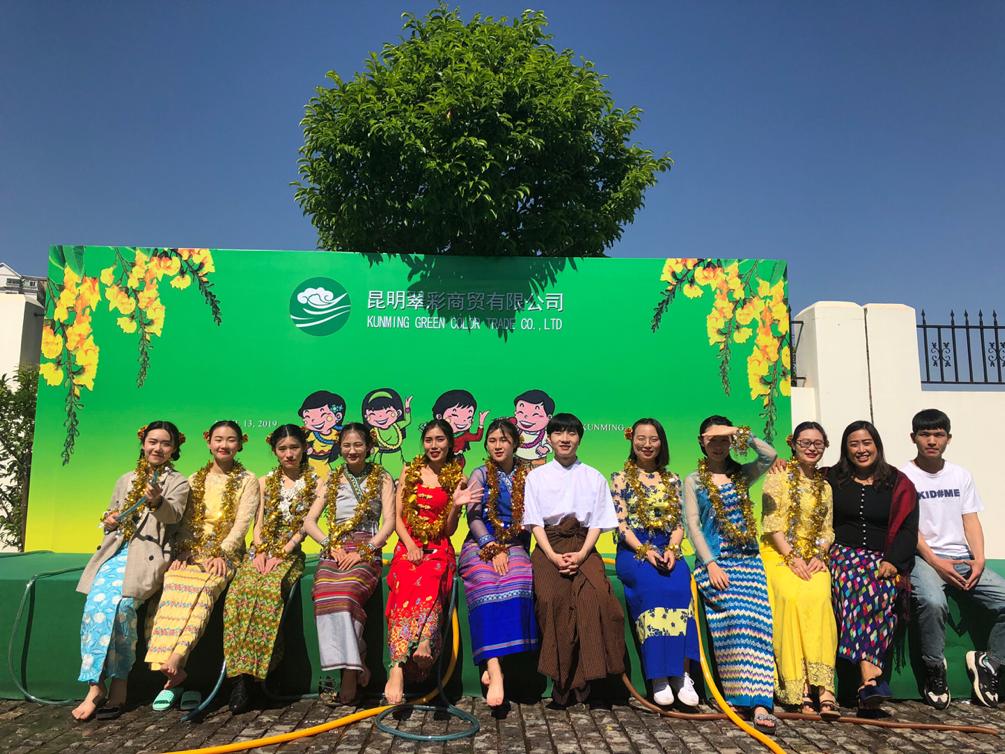 4月13日,缅甸联邦共和国驻昆明总领事馆举行泼水联欢活动,庆祝缅历新年。总领事吴梭柏携全体馆员与云南省人民对外友好协会会长,云南省人民政府外事办公室副主任,泰国、老挝、马来西亚驻昆明总领事馆总领事,云南大学副校长,缅甸在昆留学生代表,云南大学、云南师范大学、云南民族大学、昆明理工大学等院校的缅语系师生代表共300余人欢聚领馆,同庆缅历新年。J9平台缅甸语专业学生及缅甸留学生共11人参加了此次泼水节活动的文艺表演。