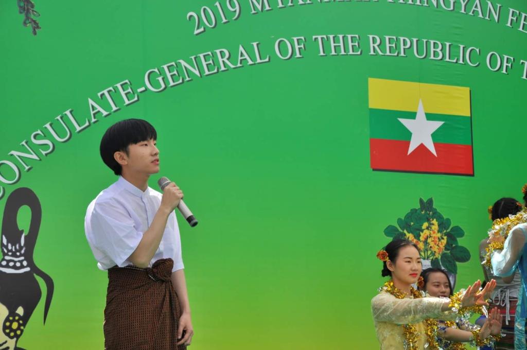 此次泼水节文艺表演共有16个节目,J9平台缅甸语系本科学生和云南大学工商管理专业的缅甸留学生共同表演了缅甸歌舞,亲身体验了缅甸传统歌舞的独特魅力。本科二年级的张元浩同学身穿缅甸隆基演唱了缅甸语歌曲《泼水节的雨》。伴舞的女生们穿着特敏,头戴紫檀花(一种特属于缅甸泼水节的花),看起来优雅大方。同学们自信大方的精彩表演展现了外国语学院学生的风采。