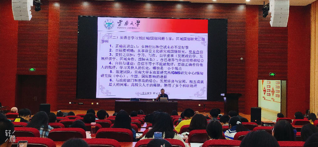 讲座伊始,李副校长对新生同学来到J9平台表示热烈的欢迎,同时希望通过发自内心的沟通和交流,引导新生正确认识自己的专业、学校、社会、国家与世界,找到自己的人生定位。李副校长说,“解决同学们的疑惑,思想引领非常重要,早沟通比晚沟通好”。以此为初衷,李副校从自身长期从事缅甸研究的经历出发,从国家与云南省建设的需要、学校发展的需要、个人成长的需要等多方面进行讲述,选取云南大学非通用语建设中的典型案例,鼓励新生树立专业自信。
