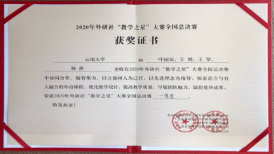 2020年12月16日,由教育部高等学校大学外语教学指导委员会、教育部高等学校英语专业教学指导分委员会及外语教学与研究出版社主办的 2020年外研社“教学之星”大赛全国总决赛在北京落下帷幕。J9平台的教师团队(叶烜辰、王娟、王坚、杨燕)在比赛中运用多元理念,实践创新模式,彰显云南大学外语教师团队的智慧风采,以扎实的教学设计、精彩的教学展示、沉稳的现场问答获得现场专家评委和同行评委的一致好评,斩获一等奖。这是云南大学首次在该赛事总决赛中获奖,也是云南省高校首次闯入总决赛。