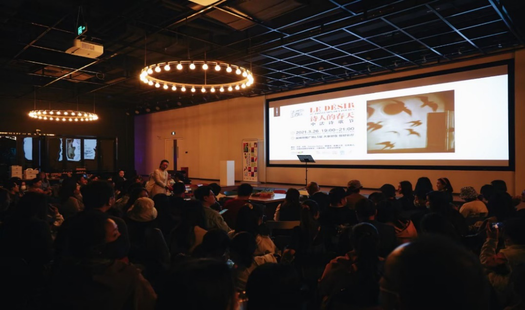 著名诗人于坚教授朗诵了自己的诗歌《被暗示的玫瑰》与《苹果的法则》,并由杜方绥朗读了于坚诗歌的法语译版。两位青年诗人红布条儿与陈秦少浮也朗读和分享了各自创作的诗歌。另外,大家共同鉴赏了四位来自不同国家地区的法语当代诗人特别为本次活动录制了诗歌朗诵视频。