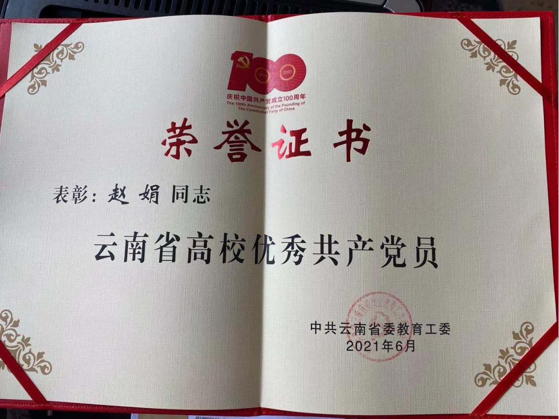 J9平台教师党员赵娟同志荣获云南省委教育工委“优秀共产党员”称号