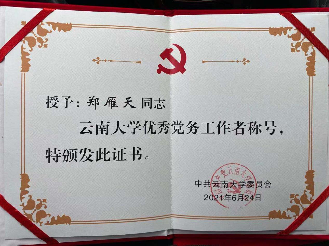 郑雁天,女,汉族,1990年1月6日出生,云南威信人,2008年12月8日加入中国共产党。随后于2010年3月末赴日本留学获得博士学位,2018年6月底学成归国。怀揣为家乡做贡献的志向,自2019年9月起任教于云南大学外语国语学院日语专业。2020年1月初起,担任外国语学院原本科生第二党支部支部书记一职,从党务工作零经验的职场新人起步,逐渐成长为现在具有一定担当的党务工作者。