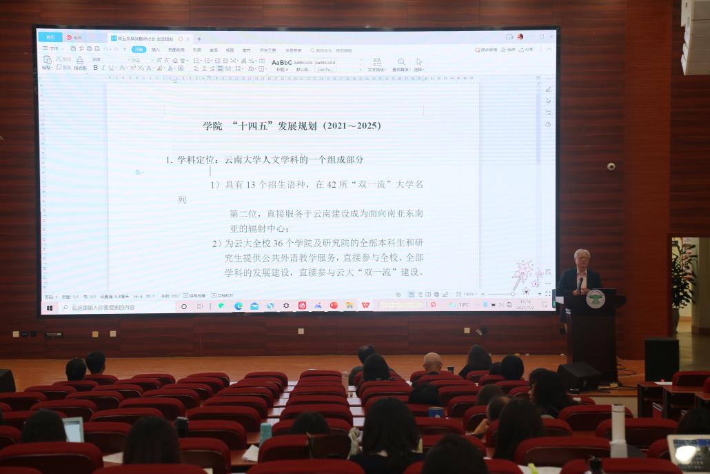 刘树森院长从外国语言文学是云南大学人文学科的一个组成部分的学科定位、以“新文科”建设为导向的发展战略,聚焦学科高质量发展、以云大平均发展指标为发展目标,对标发展的发展指标、以双一流建设为中心的工作重点对学院“十四五”发展规划进行了全方位阐述,对学院工作进行了深刻的总结。