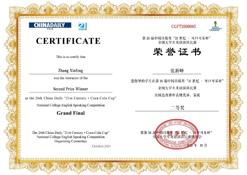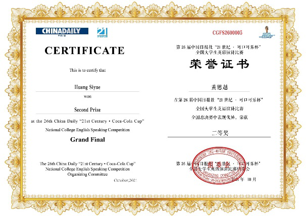 10月6日,《中国日报》社“21世纪杯”全国英语演讲比赛总决赛在成都落下帷幕,经过3天的激烈角逐,J9平台2019级英语专业黄思越同学表现卓越,脱颖而出,荣获得全国二等奖的佳绩。