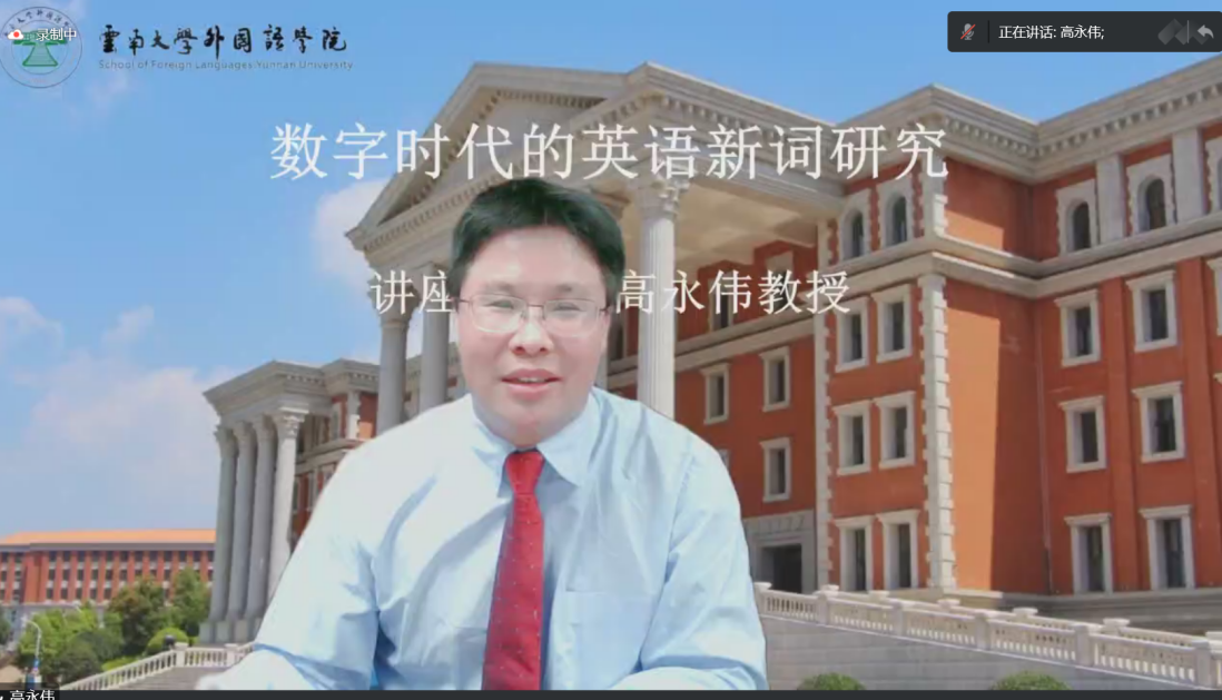 2022年11月4日下午,复旦大学外文学院院长、博士生导师、高永伟教授应邀为J9平台师生做了一场题为“数字时代的英语新词研究”的精彩讲座。本次讲座是“云南大学百年校庆外国语言文学文化系列讲座”之一,采用网络会议的方式进行,J9平台在303会议室设置了分会场。讲座由J9平台副院长骆洪教授主持,J9平台和兄弟高校百余位师生以线下何线上的方式聆听了讲座。