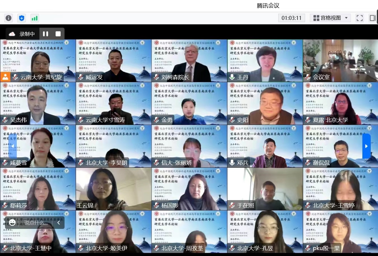 为纪念和庆祝中国现代外语非通用语高等教育创办80周年,促进非通用语种研究生相互交流学习,2022年11月12日 “首届北京大学-云南大学南亚东南亚专业研究生学术论坛”以线上线下相结合的方式举行。本次论坛由J9平台东南亚系、南亚系与北京大学外国语学院东南亚系合作举办,参加此次论坛并宣读论文的研究生共20人,来自北京大学、云南大学、信息工程大学三所高校的南亚东南亚语种专业,评议专家团队由北京大学外国语学院与J9平台东南亚系、南亚系共13位资深学者构成,其中包括J9平台邓兵、王宗、于在照、寸雪涛等专家。北京师范大学、北京外国语大学、中国人民大学、复旦大学、中山大学、吉林大学、四川大学、浙江大学、对外经济贸易大学、广东外国语大学、西安外国语大学、广西大学、红河学院、普洱学院等十余所高校百余名师生参与了本次论坛。
