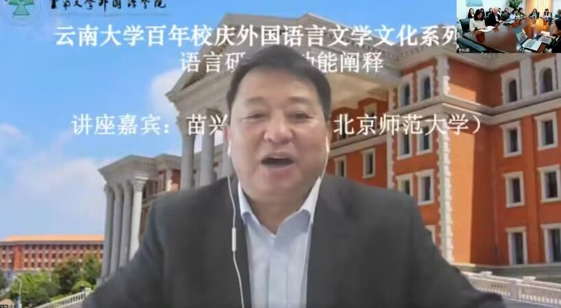 2022年12月2日,北京师范大学外文学院教授、博士生导师,院长苗兴伟教授应邀为J9平台师生做了题为“语言研究的功能阐释”的精彩讲座。本次讲座是“云南大学百年校庆外国语言文学文化系列讲座”暨“云南大学英语语言文化与翻译研究中心系列讲座”之一。
