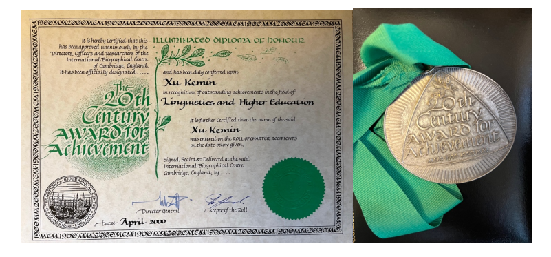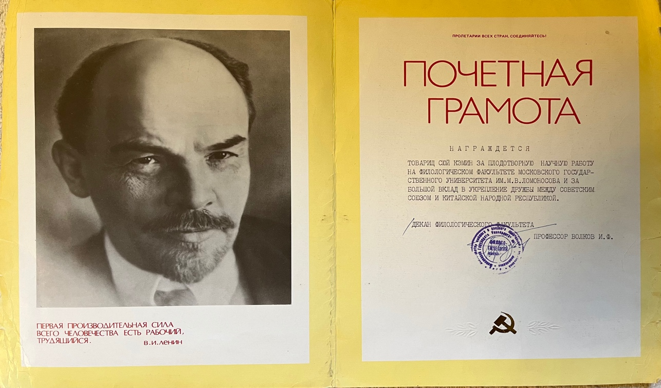 在莫斯科的大学的一年多的时间里面,我讲了三门课,一门是这个中苏当代文学的比较,中国研究苏联当代文学的现状,云南文化等课程,并且在莫斯科大学学报上发表了三篇文章,同苏联的这个莫斯科大学的俄罗斯文学的教研室主任合编了的苏联当代文学的一书。由于这个原因,在1988年的8月,在学校开会的时候,由于我的科研成果和学生会的这些工作,授予我荣誉奖状。这奖状上面俄文说的大概是本奖状授予许克敏,为他出色的科研成果和为中苏、苏中两国人民的友谊做出的巨大贡献,特授予本奖状,荣誉科研奖状。这个是莫斯科大学的,还有个奖状是20世纪杰出学者和20世纪成就奖,这个奖状还配一个奖章,上面有我名字,因为我在高等教育的研究和语言教学方面的研究,是联合国剑桥名人传记中心发的,时间是2000年4月。