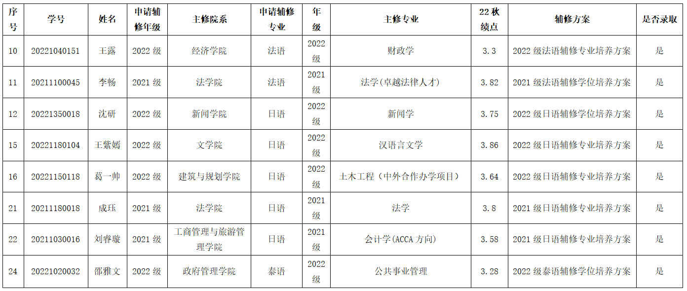 根据学校《关于做好2023年春季学期辅修申请工作的通知》相关规定,现将拟接收辅修的学生名单进行公示,详情如下: