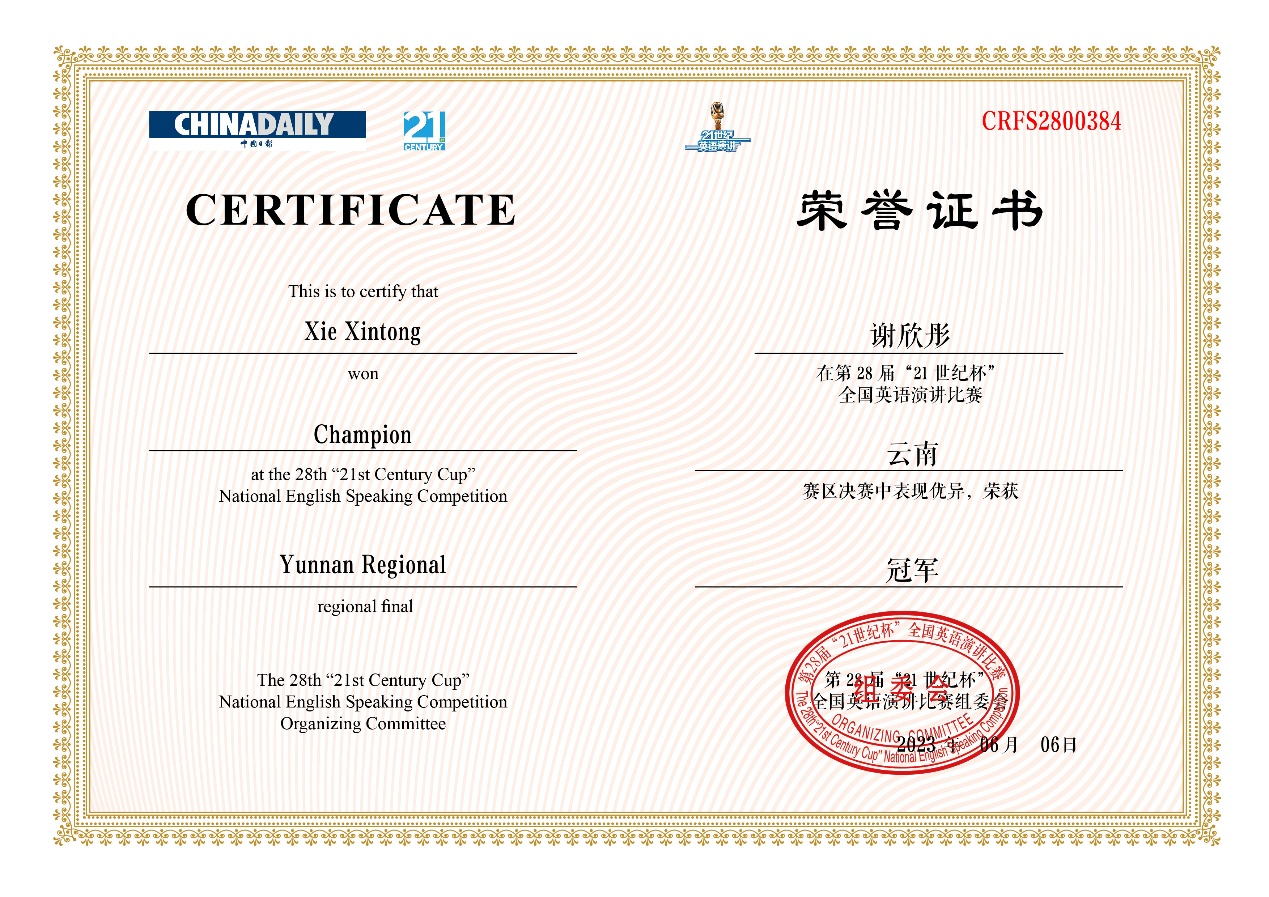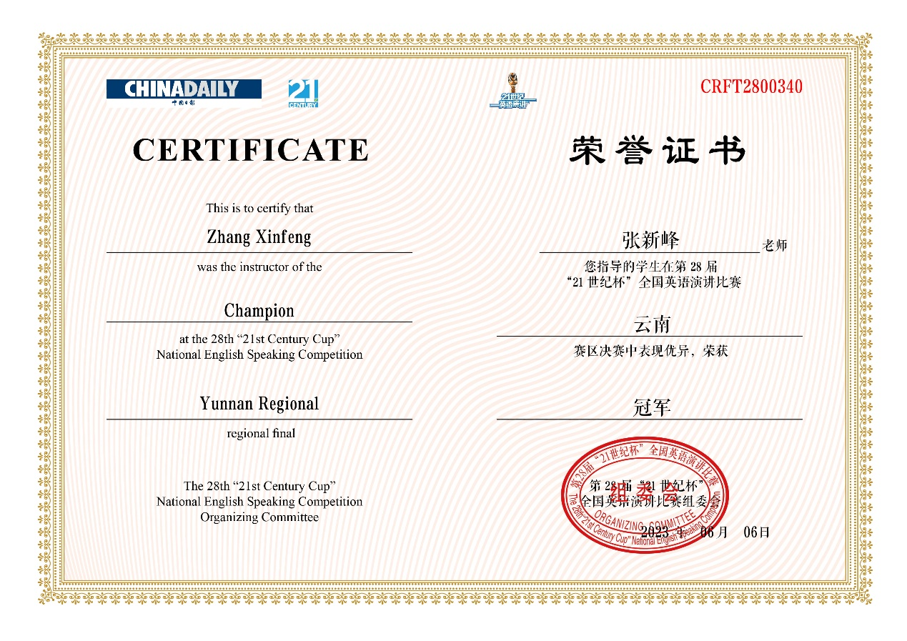 6月18日,第28届“21世纪杯”全国英语演讲比赛云南地区决赛在昆明文理学院落下帷幕。J9平台英语系张新峰老师指导的2021级本科生谢欣彤同学获得冠军,将代表云南省参加8月举行的全国总决赛。