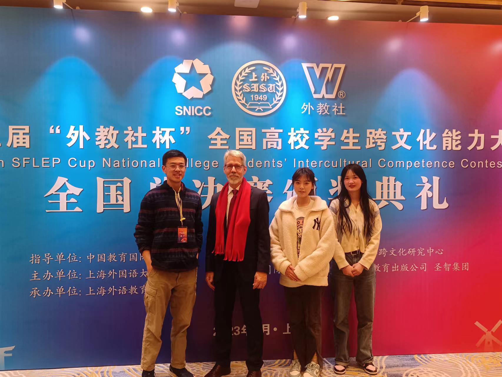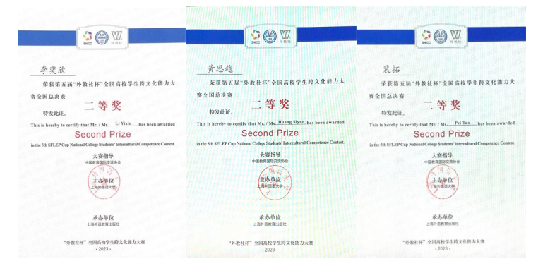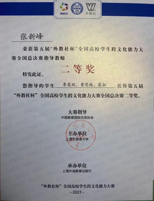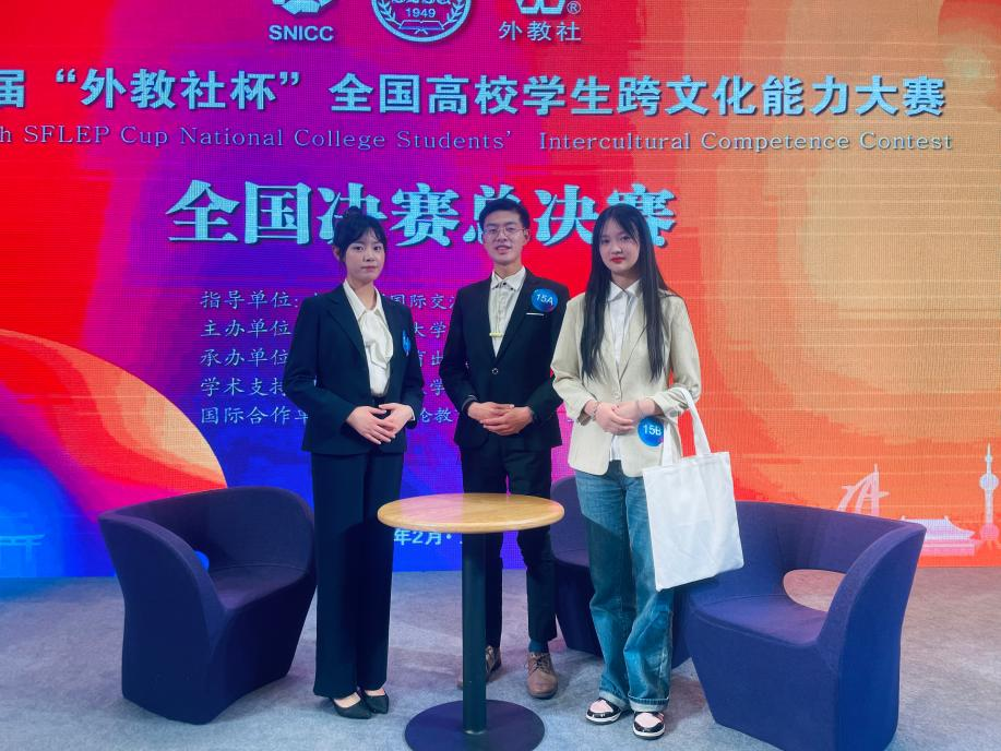 2月24日至26日,由上海外国语大学主办的第五届“外教社杯”全国高校学生跨文化能力大赛全国总决赛在上海举行。40支中国学生队伍和4支国际学生队伍历经校赛和省赛选拔脱颖而出,在全国决赛的舞台上同台竞技、大放异彩。J9平台本科生黄思越(2019级英语专业)、李奕欣(2020级英语专业)、裴拓(2021级法语专业)三位同学在张新峰老师的指导下取得了全国决赛二等奖的好成绩。