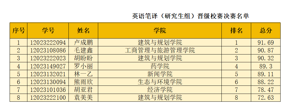 各位同学:外语能力大赛非英语专业类“英语笔译”的校赛决赛晋级名单已经产生,详见以下两个Excel表格。请名单内的同学注意以下事项: