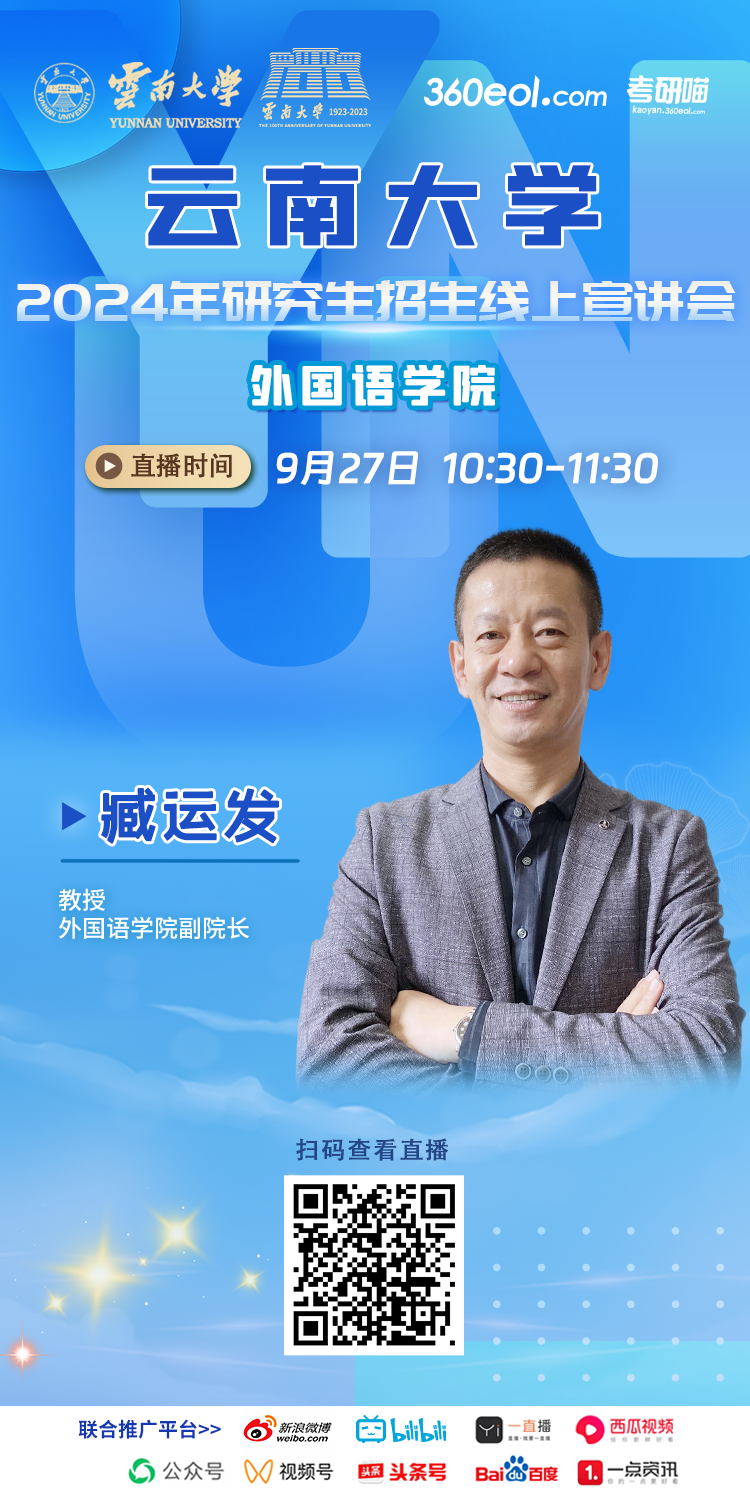 云南大学2024年研究生招生线上宣讲会外国语学院专场将由外国语学院副院长臧运发教授担任主讲人,为同学们介绍2024年外国语学院研究生招生相关事宜,并解答同学们的相关疑问。