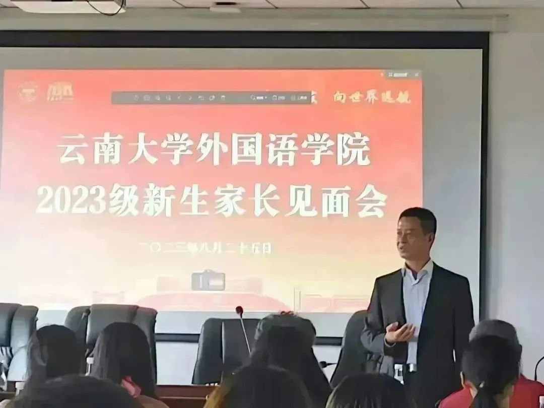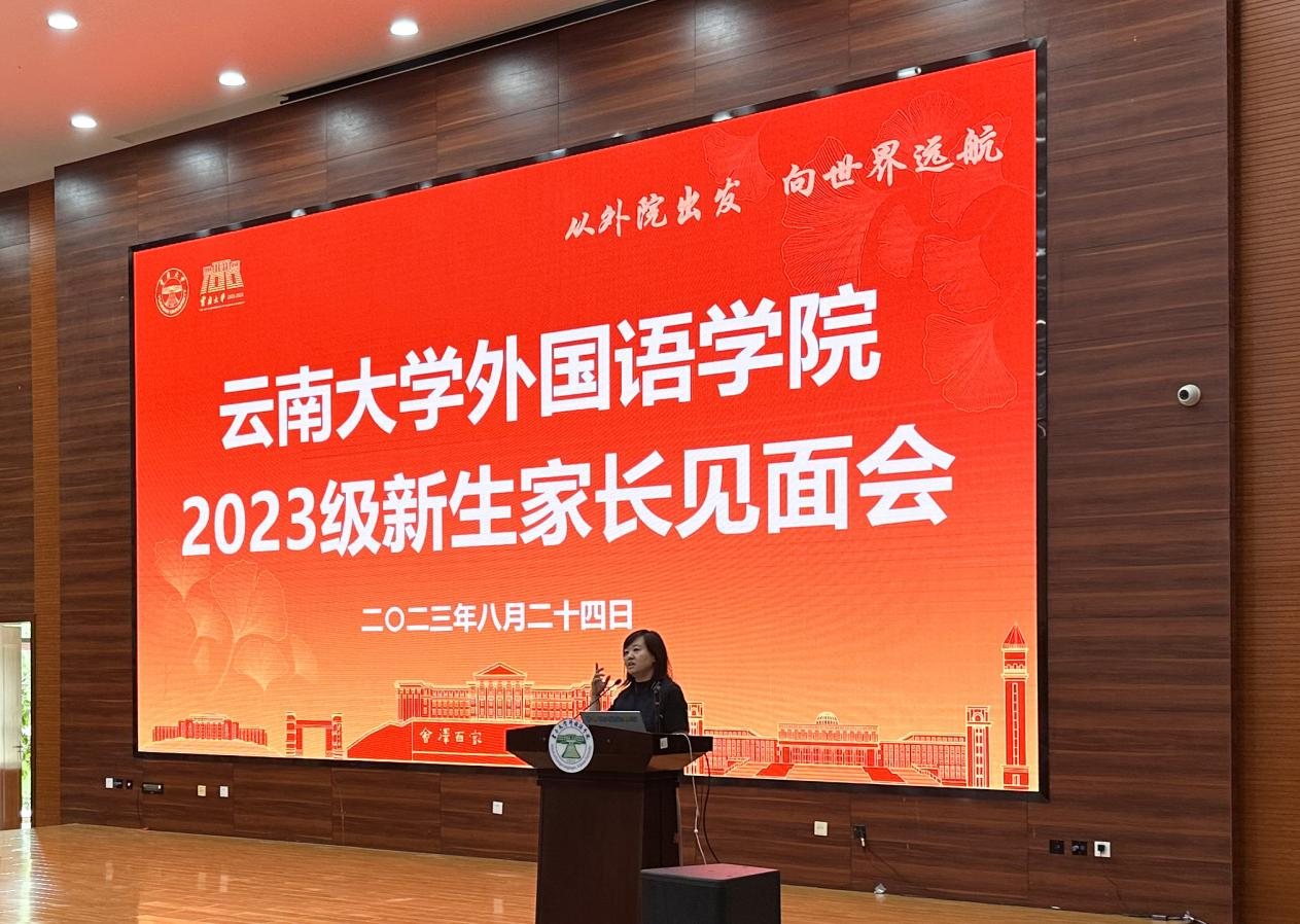 外国语学院院长刘树森老师在会上致辞。刘老师详细向各位家长介绍了云南大学的发展沿革、高校地位和战略定位,并随后切入J9平台在云南省乃至南亚东南亚的战略定位。借此向家长讲解J9平台在学生培养和未来发展的区位优势、学术优势、平台优势等,使在座家长对云南大学和J9平台有了更加深入的了解和更为贴切的认识,为同学们廓清了今后的学业及人生规划。