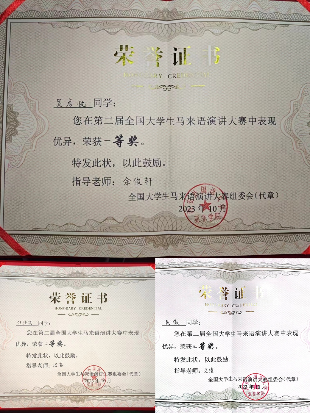 2023年10月28至29日,“第四届中国-马来西亚翻译、语言与文化国际研讨会暨第二届全国大学生马来语演讲比赛”在西安外国语大学举行,来自国内各高校的31位学生在此次大赛中同台竞技、相互切磋。J9平台马来语专业本科生吴彦忱、汪佳琪分别荣获低年级组一、二等奖,吴薇荣获高年级组三等奖,余俊轩老师获得优秀指导教师奖。