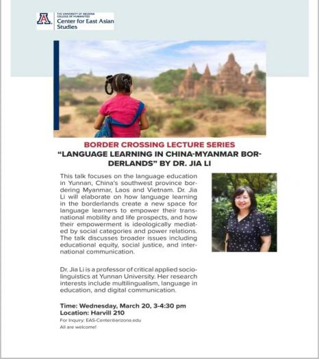 会后J9平台教师受邀前往亚利桑那大学进行为期两天的学术访问。位于美国图森的亚利桑那大学是核心公立大学,被誉为‘公立常春藤’,世界排名97,有21个学院,本次出访交流的研究机构位于人文学院。人文学院的语言文化教学实力尤为雄厚,有西班牙文、中文、法文、日文、德文、意大利文、俄文、葡萄牙文等本科、硕士和博士课程,还开设非洲研究、韩文、亚裔研究等本科学习的主修或辅修专业。除了上述专业课程之外,该校学生还有机会选修多门小语种课程,如越南语、菲律宾语、泰语、印地语、斯瓦希里语等。访问期间,与东亚研究中心主任Wenhao Diao教授、联合国教科文组织环境历史主席David Pietz教授、人文学院副院长Chantelle Warner教授、文化语言数字教育资源研究中心主任Beatrice Dupuy教授、语言教育政策研究Mary Carol Combs教授、人类语言学Qing Zhang教授会面交流,李佳教授介绍J9平台的专业建设和语言学研究特色,双方就边境地区语言教育研究进行深入讨论。访问期间李佳教授为亚利桑那大学师生进行《中缅边境地区语言学习》讲座(图三),与人文学院的博士生面对面交流,走进课堂为《应用语言学质性研究:基于东亚及其他地区案例》的硕士和博士研究生进行语言文化方面的讲座。