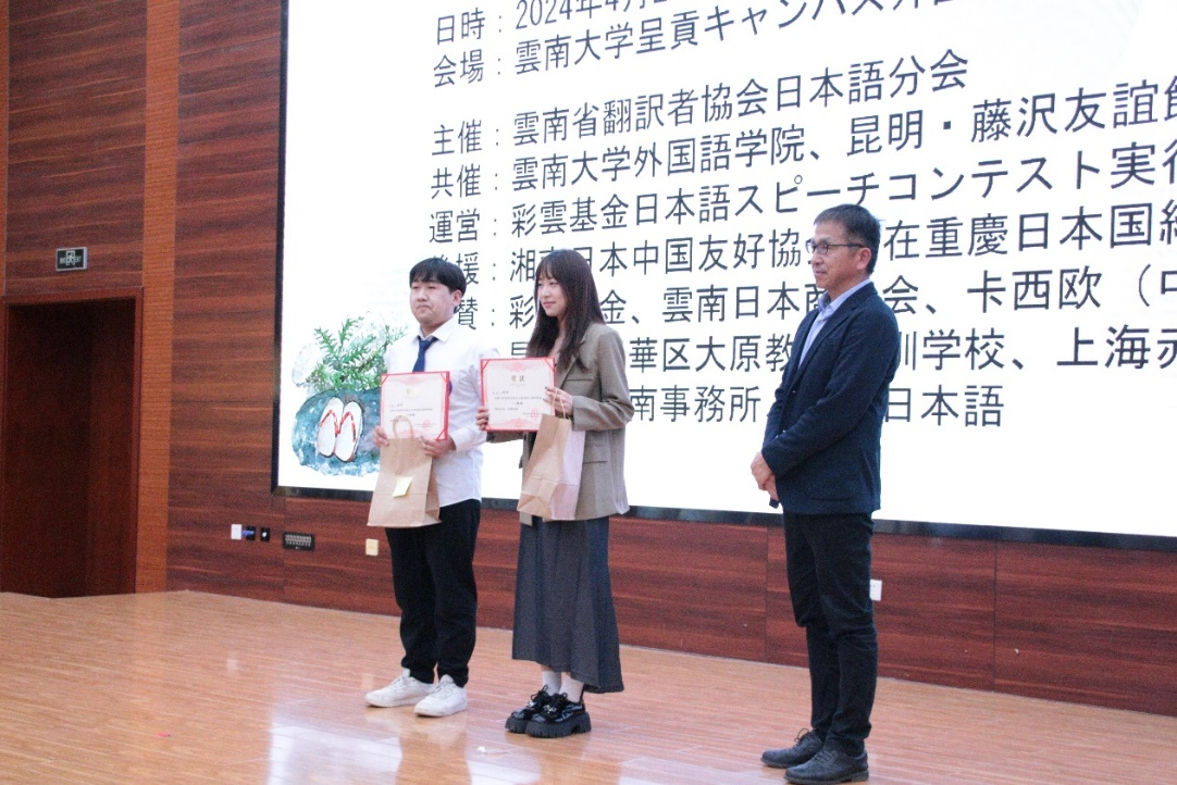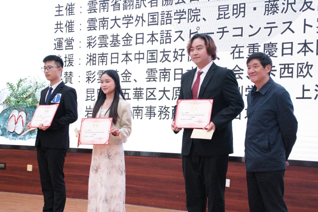 秉持公平、公正、公开的原则,第十四届彩云基金日语演讲颁奖仪式于现场进行。我校张婷同学荣获一等奖,段正红同学荣获三等奖。颁奖仪式结束后,各位选手与评委嘉宾合影留念。