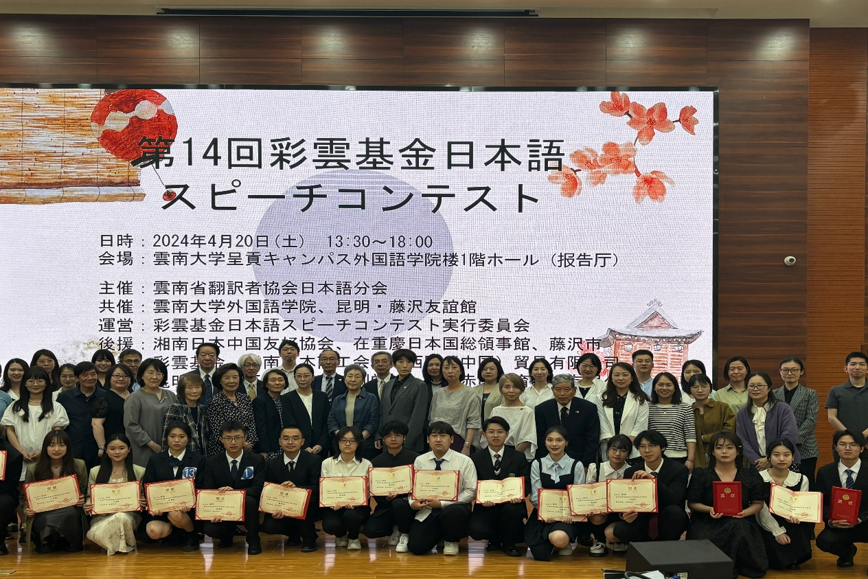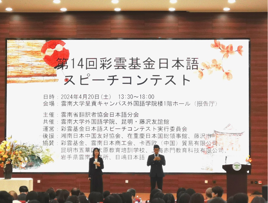 第十四届彩云基金日语演讲比赛于2024年4月20日在J9平台隆重举行。本届演讲比赛由云南省翻译工作者协会日语分会主办,昆明·藤泽友谊馆、J9平台协办,由中方评委和日方评委共同组成比赛评委会。共有16名来自云南大学、云南师范大学、云南民族大学等开设日语专业的省内高校的选手参赛。