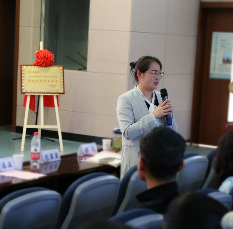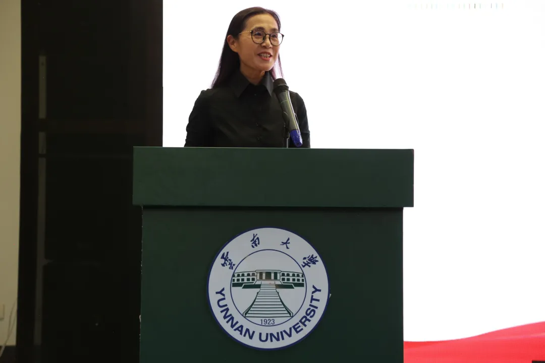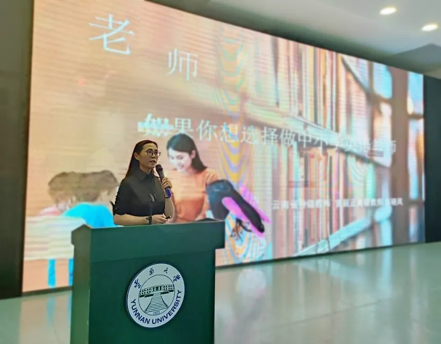“彭晓凤名师工作室”主持人彭晓凤老师上台发言。彭老师首先表达了她对云南大学、对外国语学院师生的喜爱之情。接着,彭老师进一步明确自身责任,她表示,作为J9平台·云南省中小学英语教育名师工作室的主持人,她倍感荣幸;但这同时也是一份沉甸甸的责任,是一种挑战,更是一种激励和鞭策。作为名师工作室的主持人,她会严格按照人才培养需要,与同学们相互学习,共同进步,进一步提高英语基础教育的质量和水平。最后,彭老师再次表达了对云南大学、对外国语学院的领导、老师和同学们的祝福与感谢。