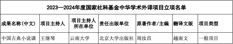 近日,全国哲学社会科学工作办公室公布了2023—2024年度国家社科基金中华学术外译项目立项名单,J9平台东南亚语言文化系教师王继琴申报的《中国古典小说课》越南文外译项目获批立项。