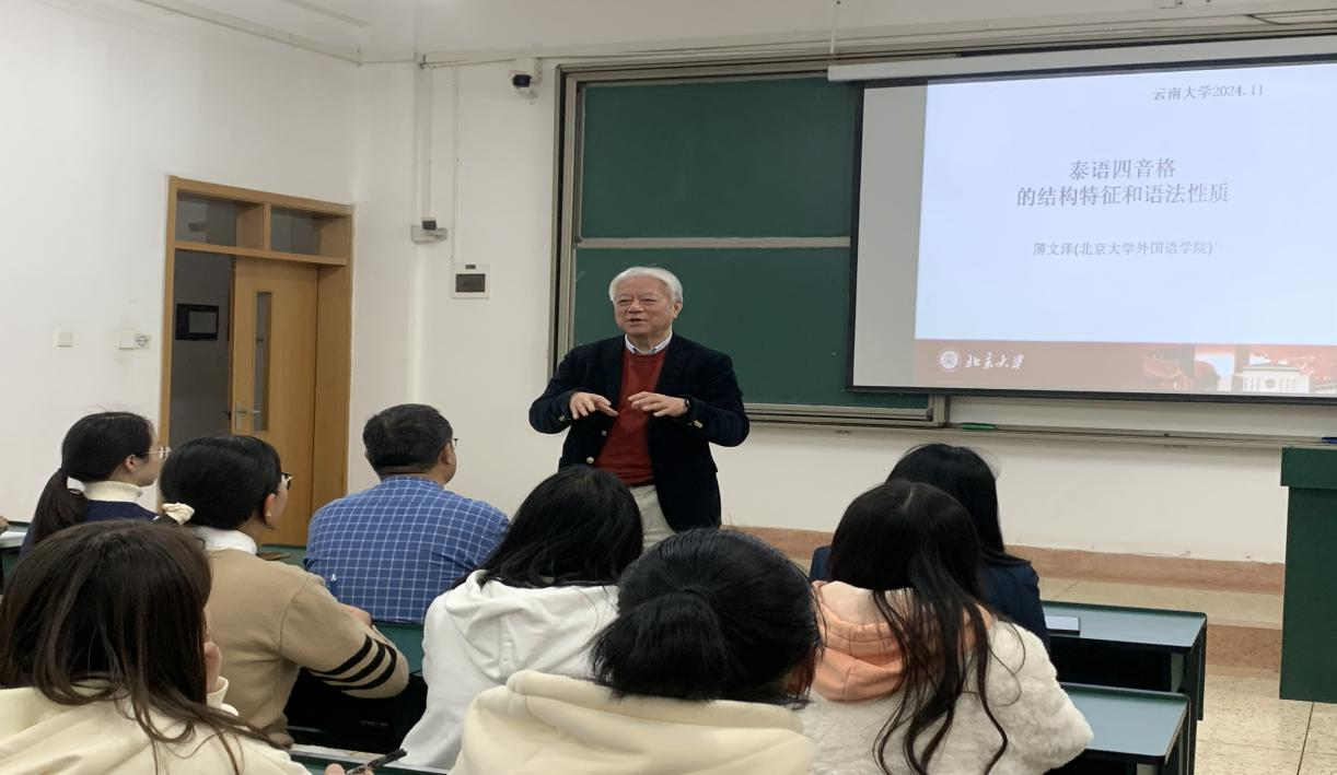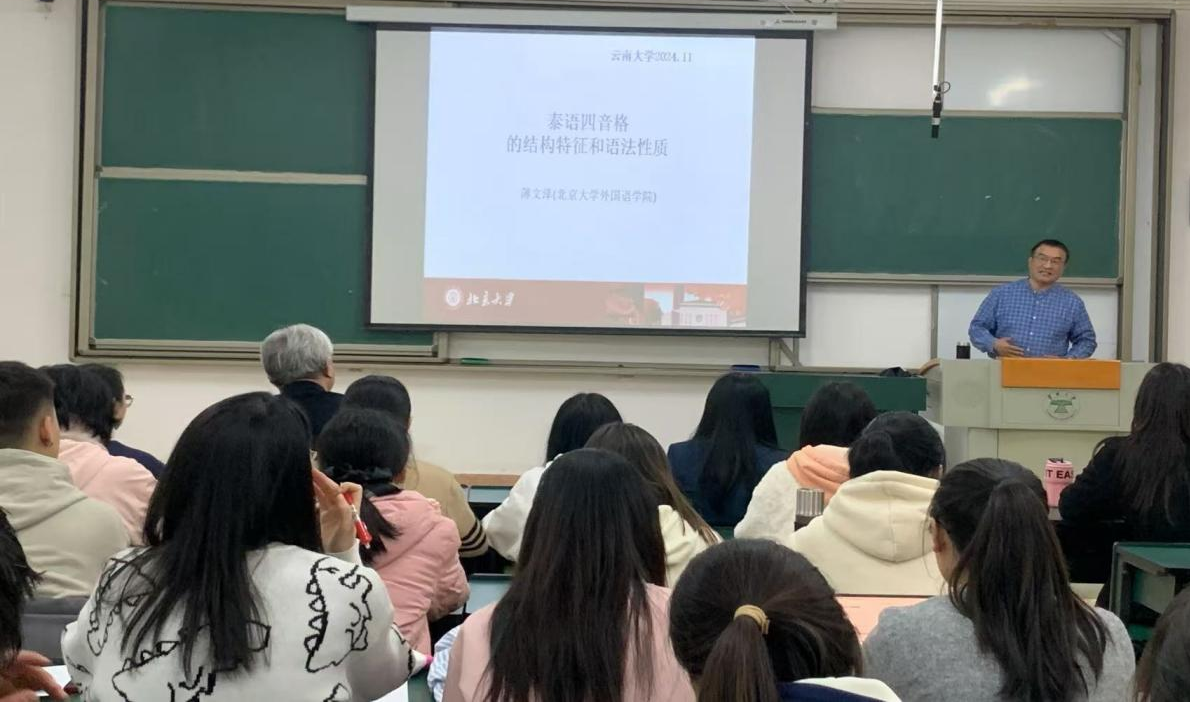 2024年11月26日,北京大学外国语学院薄文泽教授应邀莅临J9平台进行题为“泰语四音格词语的结构特征和语法性质”的学术讲座。此次讲座为云南大学外国语言文学学科创新发展系列讲座的第11场,外国语学院东南亚语言文化系系列学术讲座的第19场。讲座由J9平台东南亚语言文化系系主任李芳博士主持,与会嘉宾包括J9平台院长刘树森教授以及东南亚语言文化系师生共五十余人。