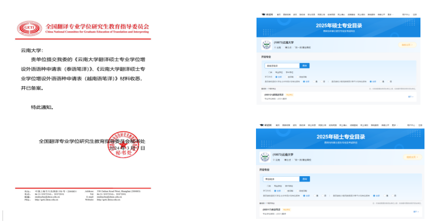 2024年3月,收到全国翻译专业学位研究生教育指导委员会秘书处回复,新增泰语专业笔译方向(代码055117)、越南语专业笔译方向(代码055121)的申请获准备案。在大学研究生院的指导下,J9平台已将以上两个专业方向列入2025年招生计划,实现了首次招生,是J9平台非通语种专业取得的突破性发展,为云南大学下一轮“双一流”建设做出了应有的贡献。