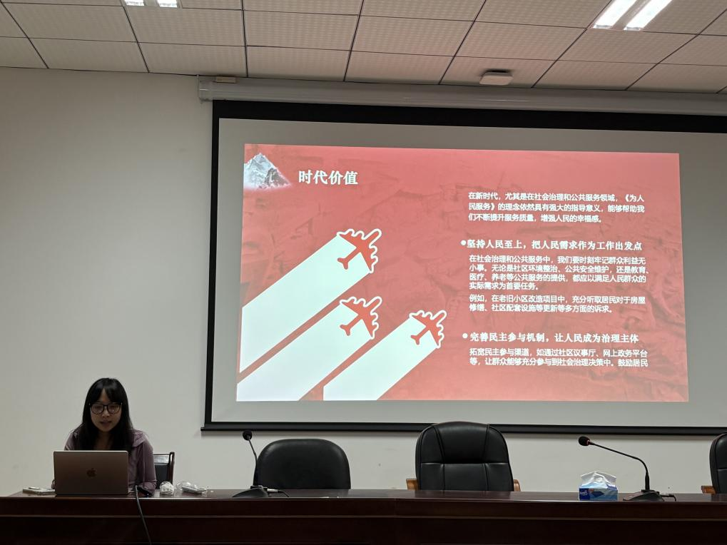 第一位分享人围绕毛泽东同志《为人民服务》一文,结合张思德同志的先进事迹,阐释了中国共产党“全心全意为人民服务”的根本宗旨,并联系新时代青年使命,呼吁同学们将个人理想融入国家发展。