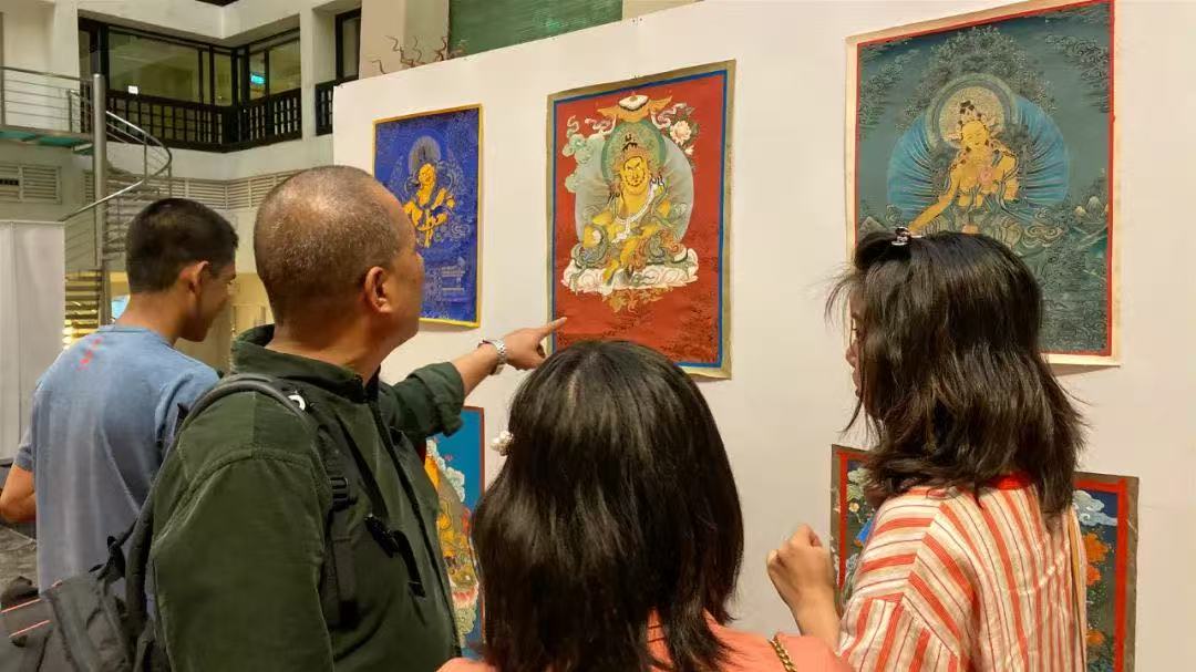 2020年1月13日,“2020感知中国·大美青海”民族文化艺术展在斯里兰卡首都科伦坡拉开帷幕。图为观众参观唐卡展品。中新社发 周少恒 摄