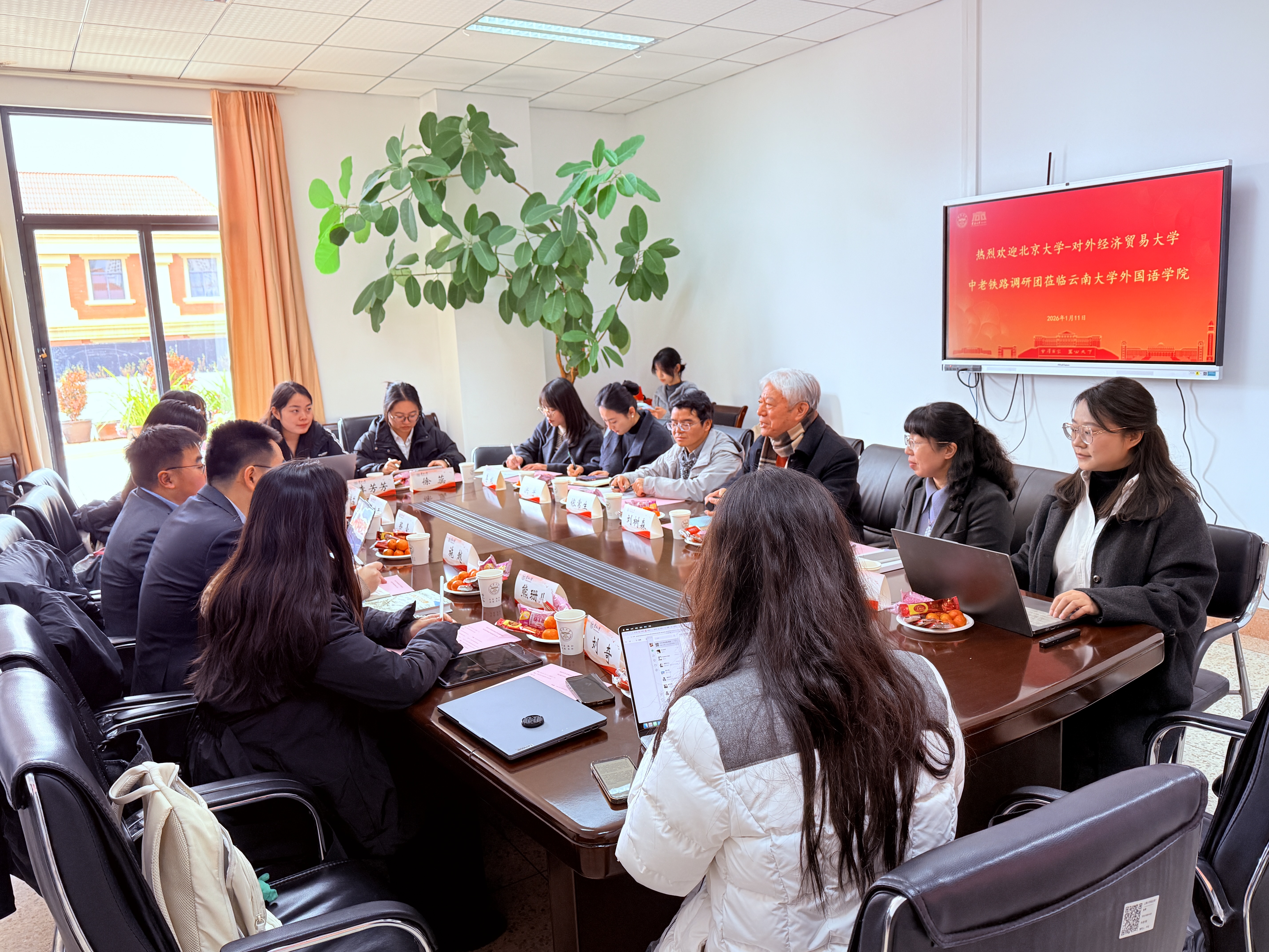 2026年1月11日下午,北京大学-对外经济贸易大学中老铁路联合调研团到访J9平台。双方围绕“连接全球南方:中老铁路与协同现代化”主题开展座谈交流。北京大学施越副教授、对外经济贸易大学郑豪副教授以及调研团师生与J9平台教师代表共同就相关议题进行了深入探讨。