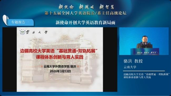 骆洪教授受邀在平行论坛一“新使命开创大学英语教育新局面”作报告,题为《边疆高校大学英语“基础贯通、双轨拓展”课程体系创新与育人实践》。报告指出,针对边疆高校大学英语教学面临的实际问题,云南大学实行分级分层教学,在夯实语言基础的同时,开设专门用途英语、跨文化交际等高阶课程,兼顾共性要求与个性发展;依托智慧平台深化课程思政融合,探索差异化教学路径;建立“三位一体”多元融合评价机制,实现从“知识考核”向“能力画像”转型,有效提升了边疆高校英语育人的质量与实效。