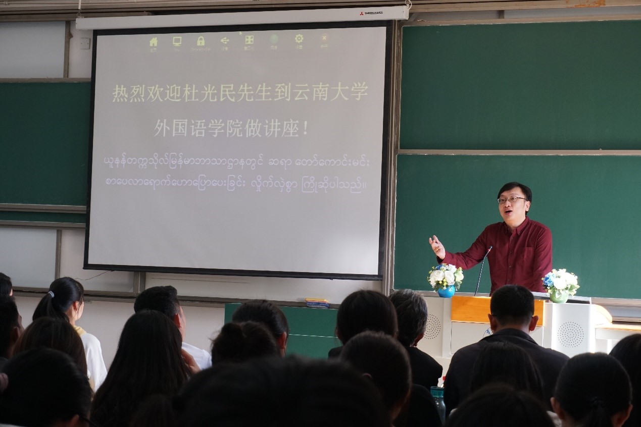 2019年9月18日,缅甸著名翻译家杜光民先生受邀到外国语学院为缅甸语系全体师生带来了一场精彩的中缅文学作品翻译体会与经验交流会。本次讲座由外国语学院骆洪副院长主持,缅甸语系全体师生、缅甸研究院部分老师、缅甸民盟青年骨干交流研修班的学员及缅甸留学生参加了此次交流会。